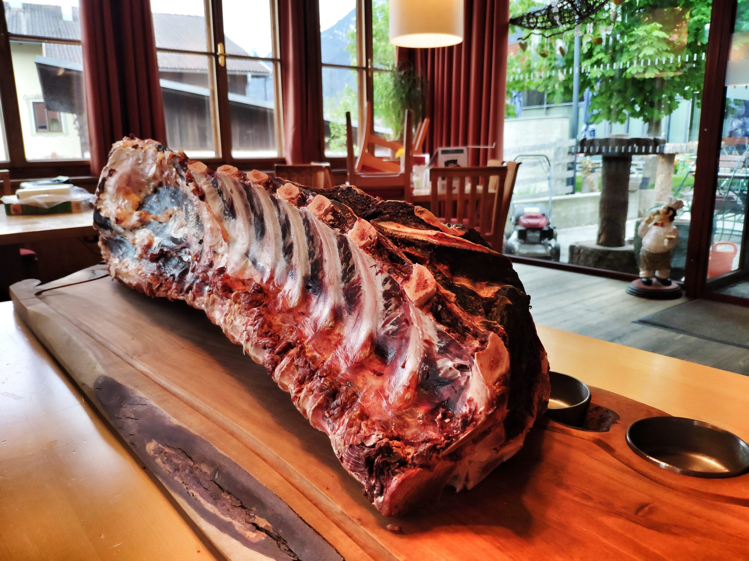 - Beim Zuputzen habe ich großzügig nochmal 1.8kg weggeschnitten -> von der Startmasse bleiben also 9.593 kg -> bedeutet ein Verlust von 35,88% zum „essfertigen“ Fleisch